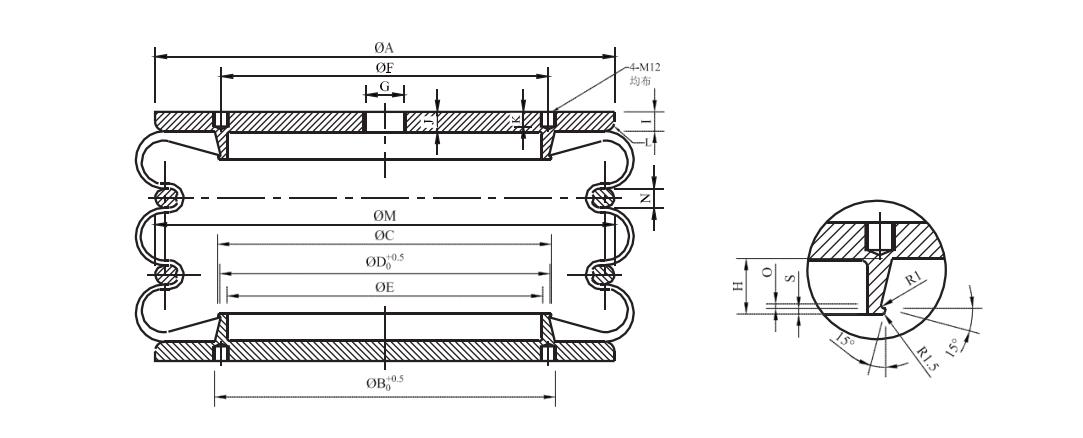 活套式橡胶麻豆传媒在线(HF型)结构: 1、密封端板(不包含组件)于产品配合面平整光滑,此板应有足够强度在承受载荷时不会弯曲变形。 2、法兰环:采用铝制或钢制 3、麻豆传媒在线:自身具有..