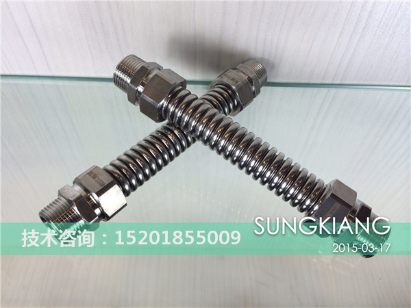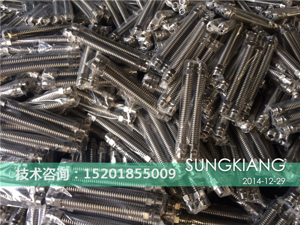 3、不锈钢金属软管,丝扣采用不锈钢304,波纹也采用不锈钢304,外面编织网也采用不锈钢304材质,耐压16kg,使用寿命:10年以上。缺点:价格太高,不易接受。