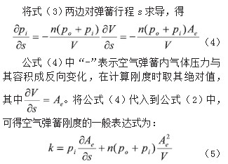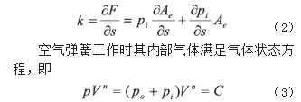 式中: k为麻豆传媒在线刚度;pi为麻豆传媒在线内气体工作压力; po为大气压力;n为气体的多变指数;Ae为麻豆传媒在线有效承压面积; V为空气体积。