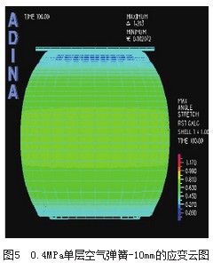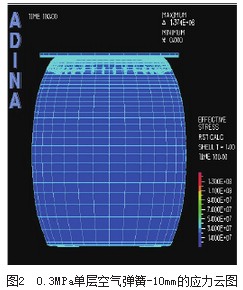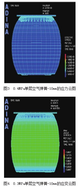 对自由膜式麻豆传媒在线的模拟工况为:麻豆传媒在线压缩到-10mm位移时,对有限元模型腔内分别设定0.3MPa和0.4MPa的初始压力,研究不同初始压力对麻豆传媒在线垂直刚度.性的影响,应力和应变的云图如图2图5所示。